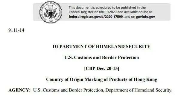 继上月14日特朗普签署所谓“香港自治法案”后,8月11日,美国海关及边境保卫局,公布了有关香港货品产地来源标记新规定的通告。