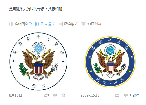 微博账号@美国驻华大使馆 显示,此次换标时间发生在8月10日。目前,已有数位网友在“头像相册”下方发表评论。