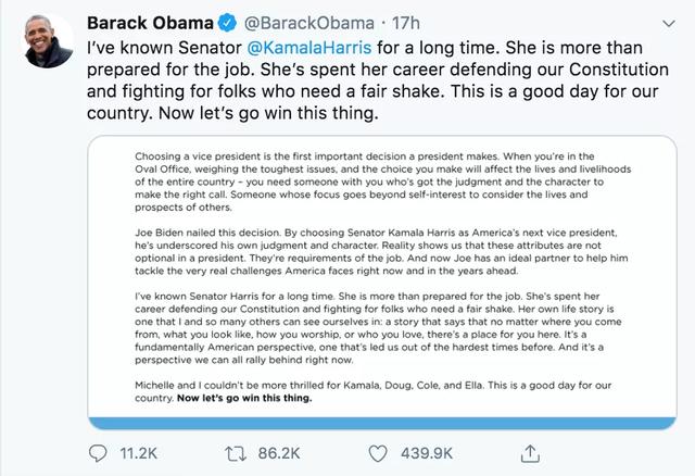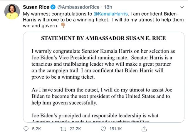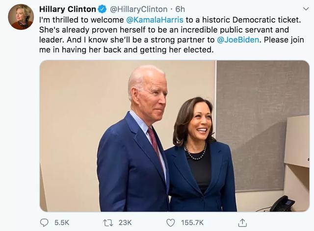 昨天下午拜登在Twitter上宣布哈里斯为副总统人选后,奥巴马、希拉里、赖斯等在Twitter上纷纷热烈打call,对拜登+哈里斯这一组合打败特朗普+彭斯、赢得11月大选信心满满~