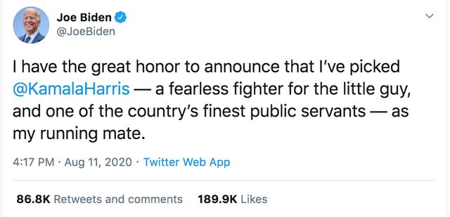 8月11日下午4点多,拜登终于在Twitter上宣布了他的决定——卡玛拉·哈里斯!他高度评价哈里斯是“为普罗大众争取利益的无畏战士“(a fearless fighter for the little guy),以及美国最兢兢业业的公务员之一。