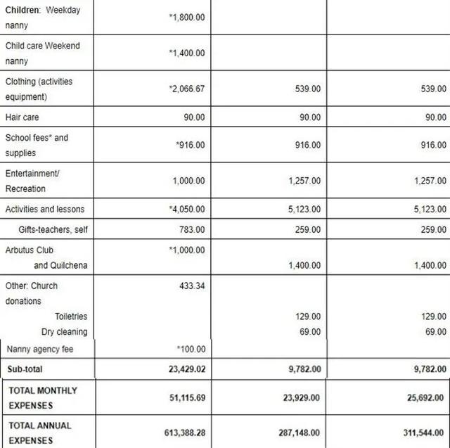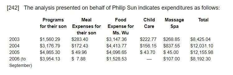 吴娜则拉出来一张清单,把法官都吓了一跳:豪门的娃娃花钱真厉害啊!按照单子上写的,孩子平时的保姆费是每周1800加元,周末的保姆费是1400加元,每个月要买2000加元的衣服……总之,娃娃每个月要花9800加元,母子两个一年要花31万加元。“应该让孙飞把这个钱一次性地都拿出来——加拿大法律不是要避免离婚后一方生活出现断崖式的下跌吗?”