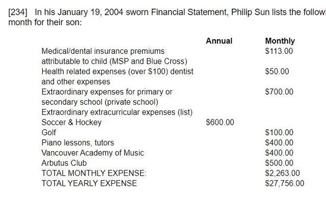 于是,法官只能先解决琐碎的“俱乐部会员”问题,规定:他们的儿子可以去Arbutus上各种课,但是孩子在餐厅的费用不能超过150加元。对于儿子每个月在俱乐部里需要的费用,孙飞认为要有个限额,不能无限制,“每月花500加元顶天了”。而吴娜据理力争,认为该是每月1100加元。最后,法官判定孩子每月在俱乐部里消费的上限为650加元,并且再三告诫吴娜,不得再有俱乐部的消费。