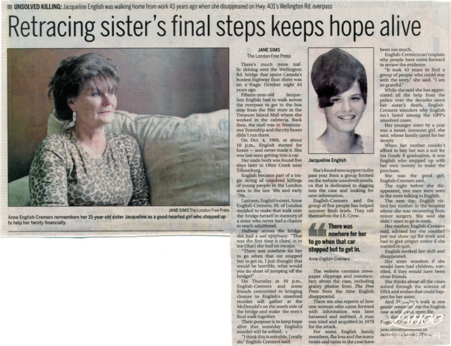 接下来,让我们回顾一些发生在伦敦的连环谋杀案。1969年10月,伦敦城外小溪,一具裸体女尸在溪边被发现。死者是一名名叫杰奎琳·英格丽舍(Jacqueline·English,下图)的青年。杰奎琳最后一次被人看见是在几天前,有人看到她下班后走过一条高速公路的天桥,钻进一辆汽车。犯罪现场的证据,以及尸体本身显示的死者死后尸体遭受的摧残都令人发指,“这一切特性,包括受害者、死亡方式,都非常符合我的alpha类连环杀人案。”迈克说。