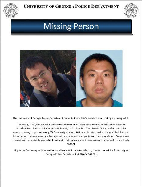 此前在周一下午,王被报告失踪。UGA News网站报道,警方周二称当日下午4点左右,王的尸体在大学站路靠近北奥科尼河附近的树林里被发现,初步调查表明死亡是自己造成的,没有谋杀迹象。