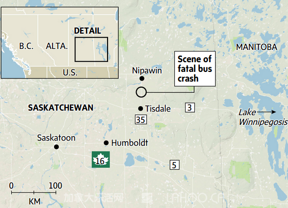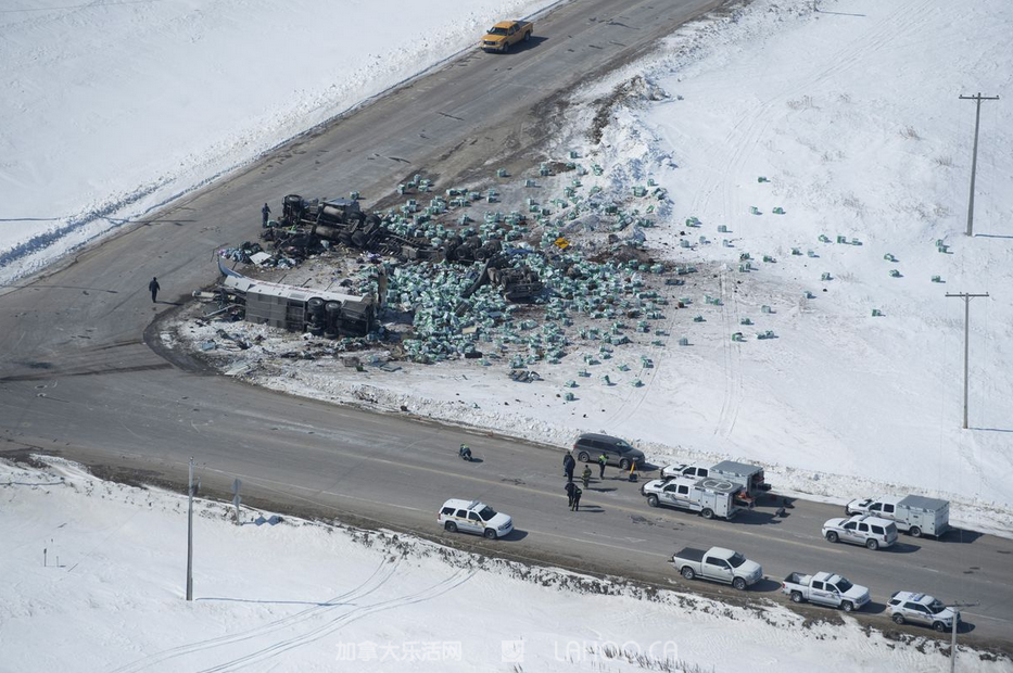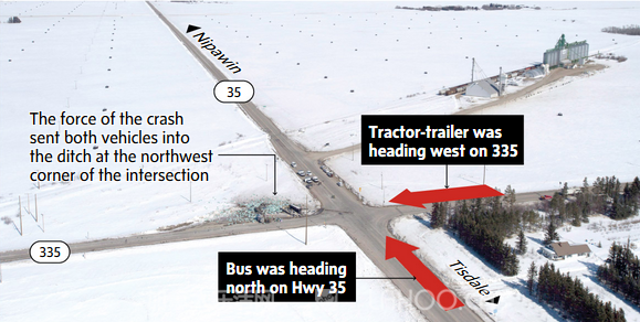 据《环球邮报》报道,事故发生在当地Highway 35和Highway 335的交叉路口,距里贾纳(Regina)大约300公里的地方,两相撞车辆均损毁严重,现场相当惨烈。巴士车的侧面及顶部与车身脱离,货柜车则翻倒在一旁,车上的泥炭藓货品散落一地。货柜车司机没有受伤,目前正在接受心理治疗。