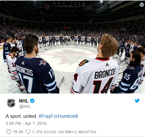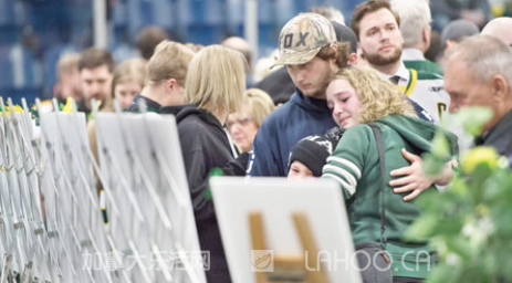 北美冰球队伍所组成的职业运动联盟NHL也于上周六晚间在全北美的竞技场举行了悼念活动,所有球员都将洪堡野马队的队徽贴在头盔上,以示哀悼。