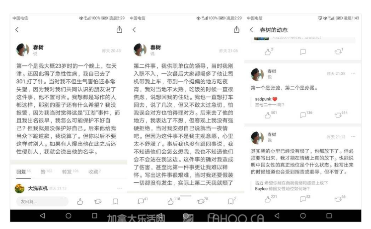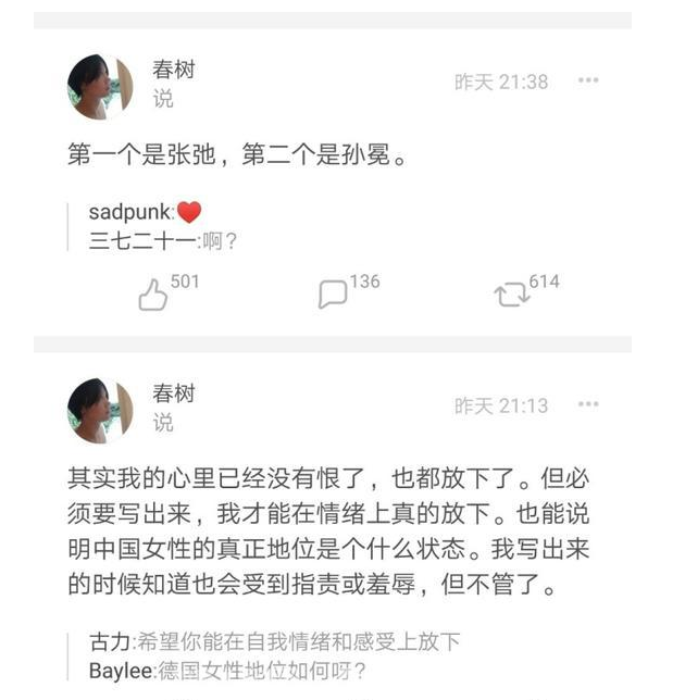 女作家春树:曾遭作家张弛和新周刊创始人孙冕性侵2020-09-14 |作者: | 来源:法律Loading...分享: 昨天(7月25日),蒋方舟曝光了资深媒体人章文对自己做的恶心事,遭到舆论谴责,之后,又有几位女性讲述了自己的遭遇。 作家春树也曾遭遇性侵。 第一个上时代周刊封面的80后女作家春树在豆瓣上曝光自己曾经被性侵和胁迫发生性关系,其中一个还是新周刊的创始人孙冕。 孙冕在2010年10月18日曾发了一条关于春树的微博,然而已经被删了。 本文发布于: 2018-7-26 00:06 阅读 未经允许不得转载:加拿大乐活网 »女作家春树:曾遭作家张弛和新周刊创始人孙冕性侵分享: