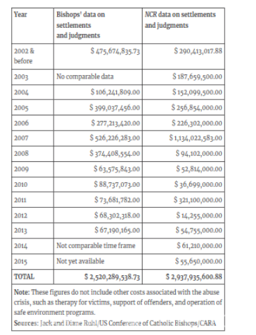 目前在全世界至少26个国家有针对天主教神父性侵儿童的刑事案件。而由于众多保密协议条款,教廷为这些性侵案的受害者支付了多少赔偿金一直不为人所知。据《经济学人》和《全美天主教报告》的调查,自2002年起,美国天主教会至少已经为儿童性侵案件支付了30亿美元。