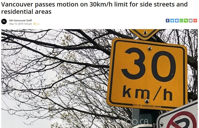 昨天很多媒体都发布了这样一条新闻:全票通过!温哥华要全城限速30km/h!实际上仔细看英文媒体报道,这是误导,真正限速的是在城市小街道和居民区,且是没划分对向车道的单车道,由原来的50km/h下调至30km/h限速。