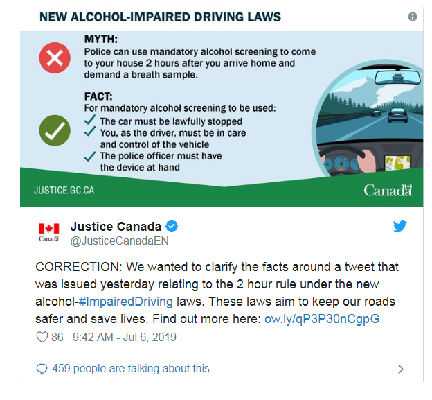 开车过后检测血液里的酒精浓度,这种做法似乎有点不讲道理,甚至连加拿大司法部也不确定这样做是否合理。7月6日,司法部的官方推特转发了这条法规,随即又删除了。