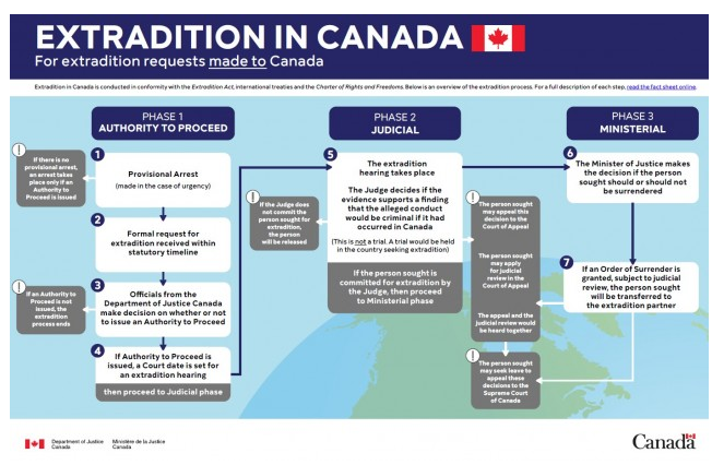 (加拿大乐活网lahoo.ca3月4日电)据加国无忧报道,3月1日,加拿大方面宣布,将开启对华为公司首席财务官孟晚舟的引渡流程。为帮助民众更好地了解引渡流程,司法部制作了一张简易流程图,供公众阅读。