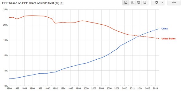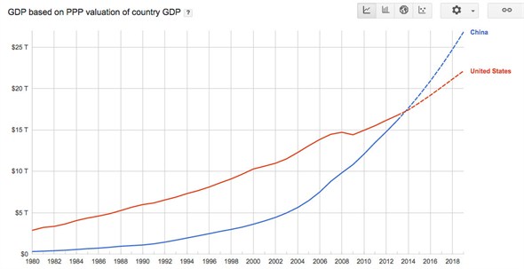 上图为中美按购买力平价计算的GDP发展趋势,蓝色曲线代表中国,红色曲线代表美国,单位为万亿美元