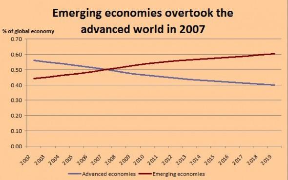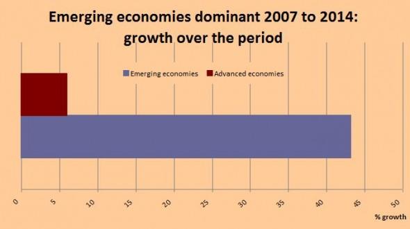 金融危机爆发之后,发达国家的经济速度大幅放缓。2007-2014年间,新兴国家的经济增速是发达国家的五倍之多。