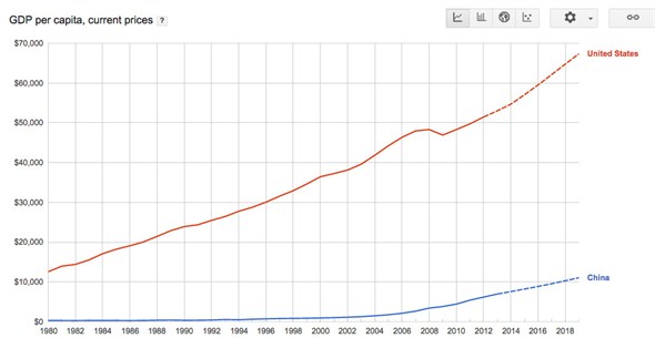 上图为中国年人均GDP,蓝色曲线代表中国,红色曲线代表美国,单位为美元