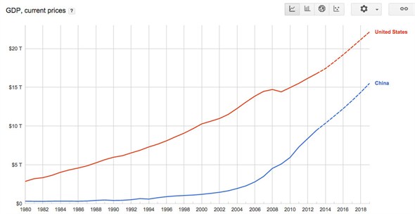 上图为中美绝对经济规模,蓝色曲线代表中国,红色曲线代表美国,单位为万亿美元