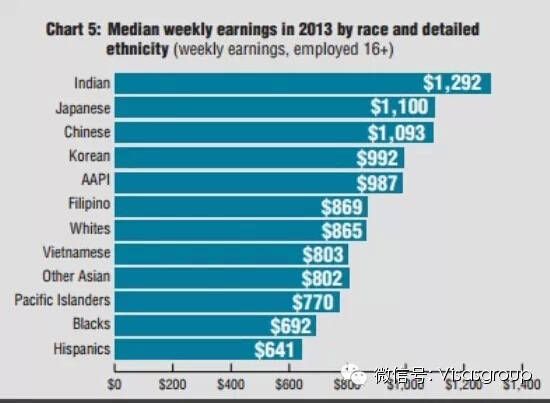 美国联邦劳工部8月28日公布2013年《全美亚太裔在萧条复甦后的经济地位》,亚太裔的薪资、教育水平和就业率都比白人及其他少数族裔表现佳,其中又以印度裔移民表现最为突出。25岁以上印度裔就业人口有76.1%有大学学位,华裔有56.8%;16岁以上劳动人口的平均周薪也以印度裔的1291元最高,华裔1093元,白人、非裔、西语裔分别是865、692、641元。这是根据劳工部三年前的「亚太裔劳动力与美国经济复甦报告」所做的更新报告。