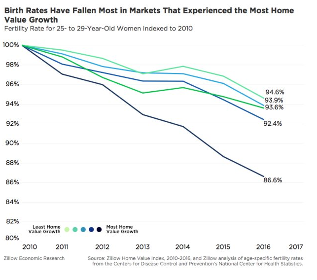 Zillow的模型显示,若房价每升高10%,美国25-29岁育龄妇女的生育率就降低1.5%。这个结论也得到Zillow进行的市场调查结果所支持。该年龄组中82%的受访者表示,生儿育女毕竟需要大笔开支,为了家庭财务的稳定,我们宁愿推迟要小孩。