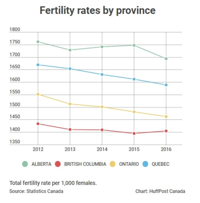 实际上,在2012-2016年间,加拿大总体生育率呈下降趋势,2012年平均每个育龄妇女生1.6个小孩,而在2016年则平均只生1.5个小孩。