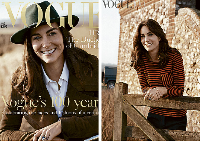 凯特今次追随戴妃步伐,成为《Vogue》6月号百周年纪念版的封面人物。中央社报道,封面照的凯特一身乡村风打扮,戴着绿色帽、穿着白色衬衫和啡色外套,笑容灿烂。在另一张照片中,凯蒂则穿着红黑相间条纹上衣和黑色长裤,倚在木栏上。