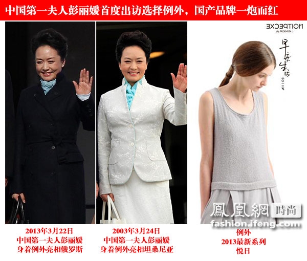 彭丽媛陪同习近平主席首次出访国外,当他们第一站抵达俄罗斯时,彭丽媛的服装、皮包立刻成为瞩目的焦点,一时间网络上纷纷盛传、猜测它们的品牌、设计师。最后,国产高端品牌“例外”成为“最佳嫌疑人”。广州市质监局也主动联系媒体,确认了这一说法。