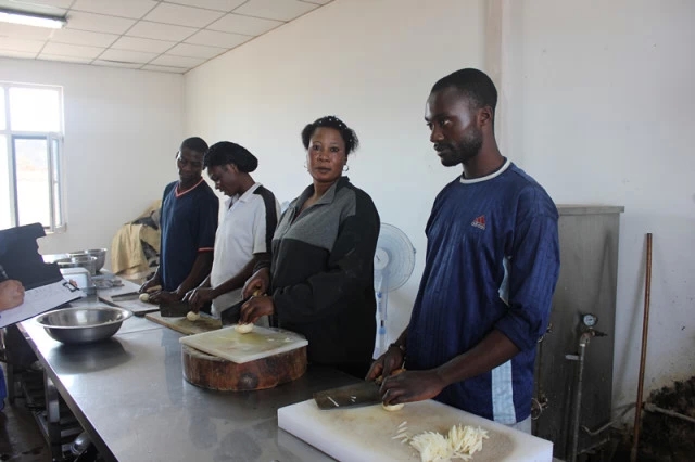 无论是木薯粉或是cima粉,“烹饪”手法都一样。将面粉加水置于锅中,一边加热,一边用木棍不断地搅动,直至达到一定稠度。这里所说的“锅”,其实就是一个奶粉罐,或者其他铁皮罐。而他们的调料,无非就是盐巴、辣椒和一种自制的番茄酱。当地的辣椒如小指大小,呈圆形,辣度远超国内的小米椒。他们也没有碗筷刀叉之类的餐具,吃饭时,直接用手从“锅”中抓取面糊糊,捏成团状(我们称之为“团团”),蘸着另一个“锅”中的汤汁——由木薯叶子、洋葱和番茄酱熬制而成——进食。