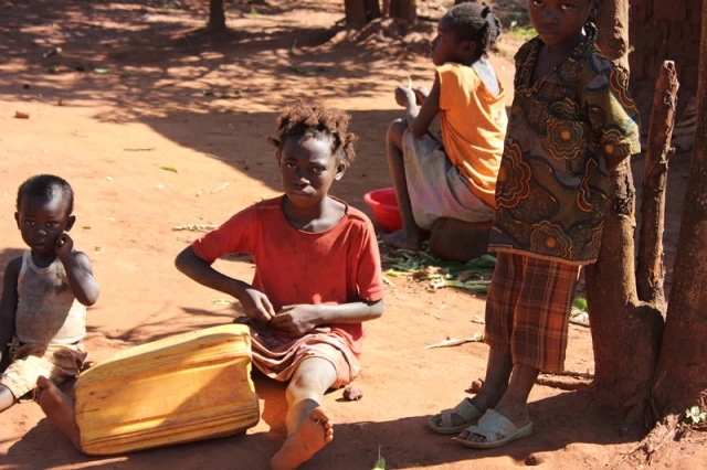 像这样的饭食,一天就一顿。有时就靠着几个芒果、两根香蕉过上一天。从村里小孩圆滚滚的肚子就可以知道,他们正遭受饥荒。