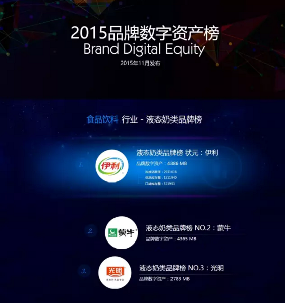 11月19日,在百度营销盛典Moments上,百度品牌数字资产榜揭晓,伊利位列“2015年百度品牌数字资产榜”液态奶第一。这是伊利跨界营销的成绩,也是互联网+中国智造的成果。伊利跨界玩出彩,将自己的营销融入了数据化和未来科技,华丽丽地变身一位营销极客。