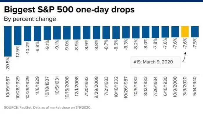 美东时间周一,美国股市开盘4分钟左右,标普500指数暴跌7%触发了第一层熔断机制,暂停交易15分钟