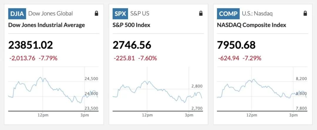 恢复交易后三大股指继续下跌,其中,道指、标普500指数盘中均一度跌超8%