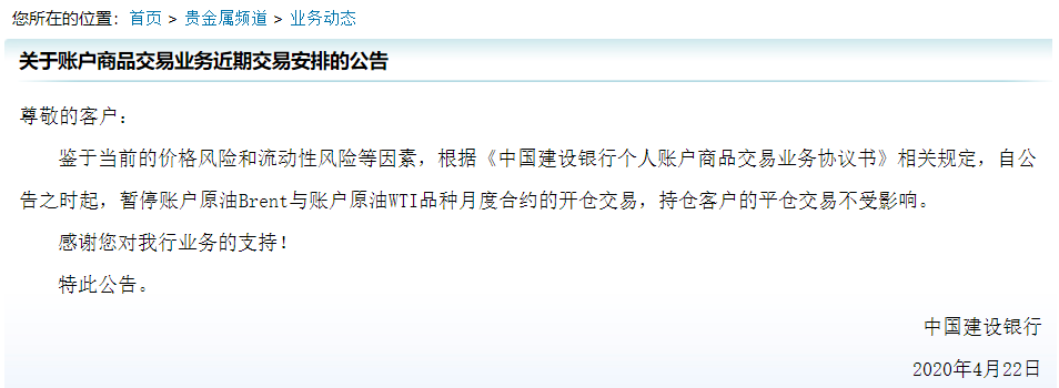 4月22日晚间,建设银行再次发布关于账户商品交易业务近期交易安排的公告称,鉴于当前的价格风险和流动性风险等因素,自公告之时起,暂停账户原油Brent与账户原油WTI品种月度合约的开仓交易,持仓客户的平仓交易不受影响。