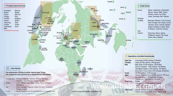 根据国际货币基金组织的数据,世界各地现金流量前十名分别为:英国(伦敦金融城)、美国(特拉华州)、卢森堡、瑞士、开曼群岛、爱尔兰、中国(香港)、新加坡、比利时和百慕大群岛。