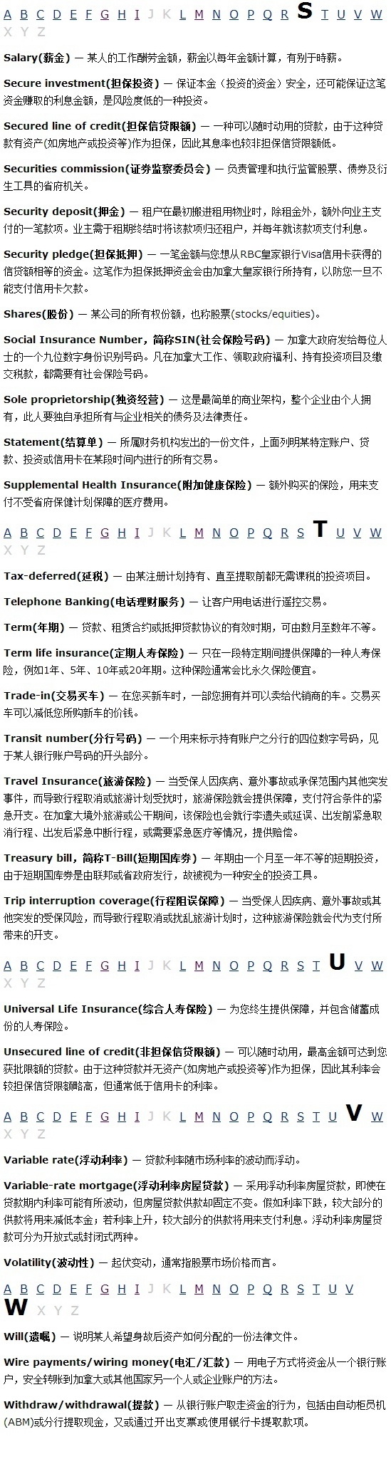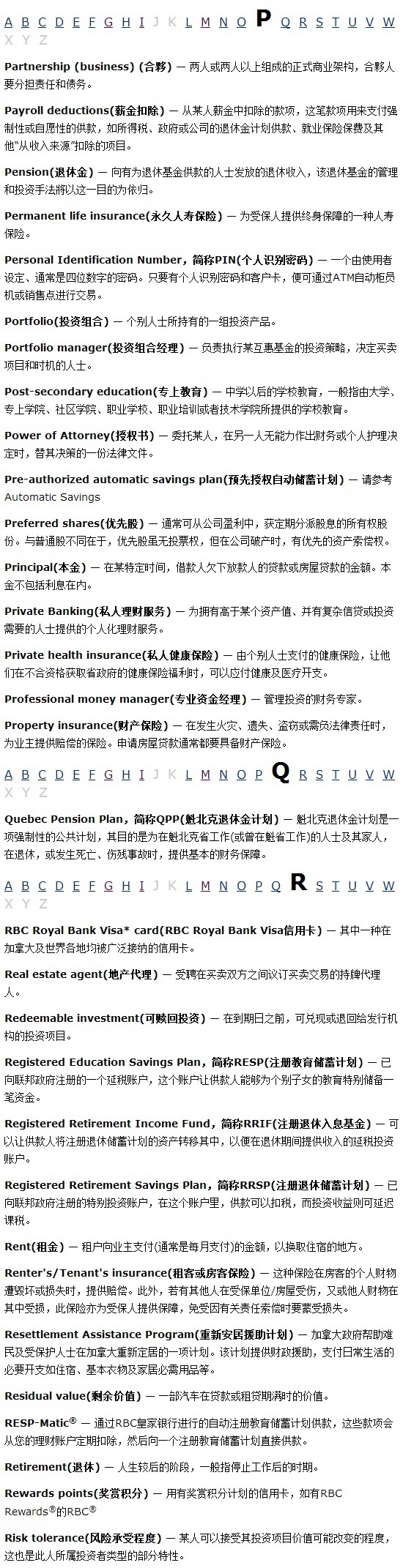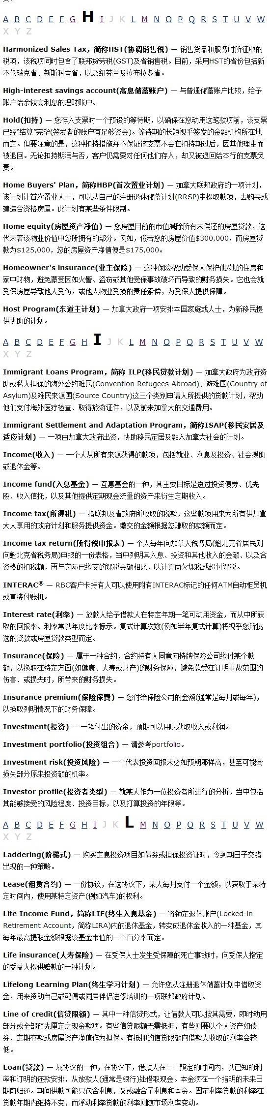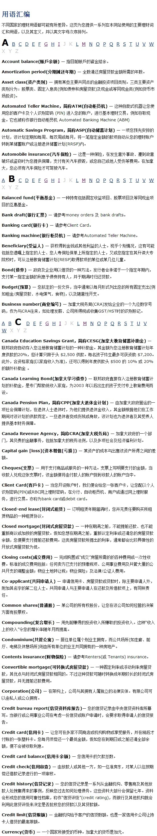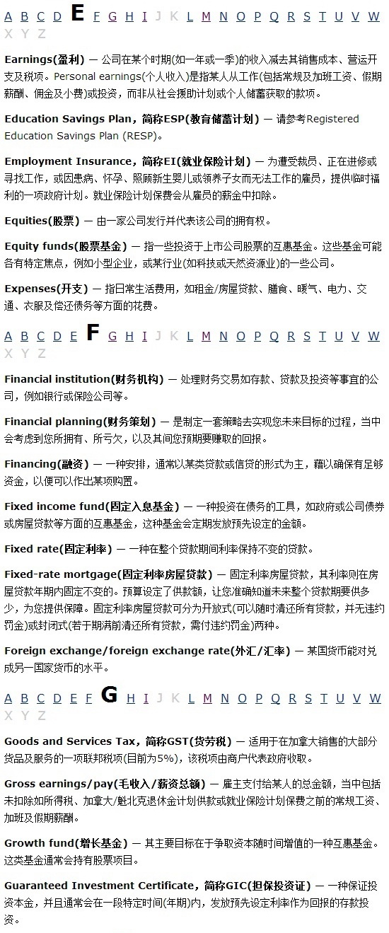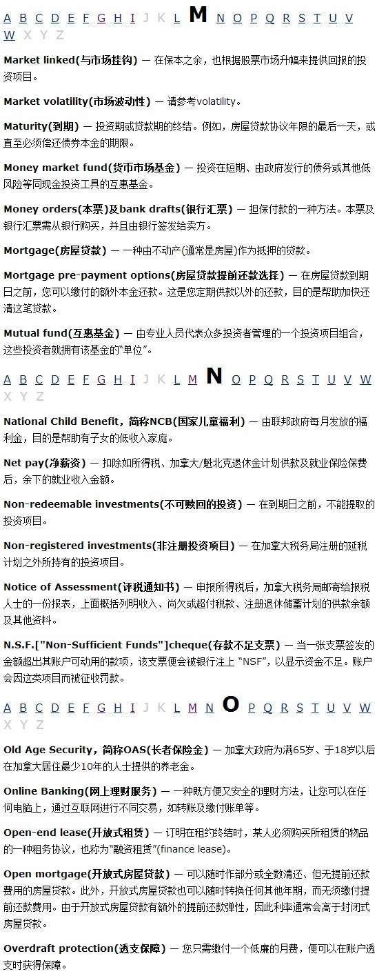 报税必读 加拿大理财和税务常用词汇编2020-09-24 |作者: | 来源:财经Loading...分享: 不同国家的理财用语都可能有所差异。这页为您提供一系列在本网站使用的主要理财词汇和用语,以及其定义,并以英文字母次序排列。 本文发布于: 2013-3-7 16:34 阅读 未经允许不得转载:加拿大乐活网 »报税必读 加拿大理财和税务常用词汇编分享: