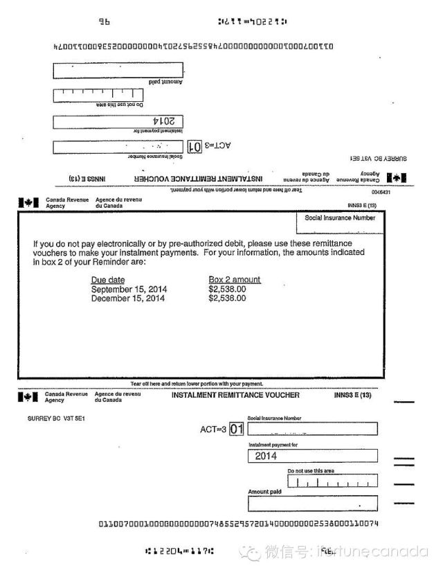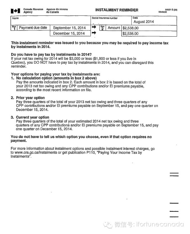 加拿大税务局通常会给他们认为可能需要缴纳预缴税金的纳税人发出预缴税金提醒单。提醒单上显示的金额是建议性的。如果你可以肯定你的2014年应缴个人所得税金额不会超过$3,000加元(魁北克$1,800加元),则即使收到预缴税金提醒单,你仍不需要缴纳预缴税金。
