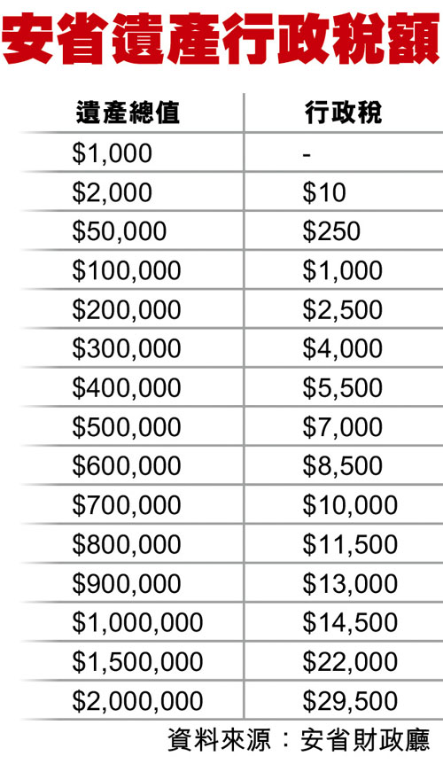 安省的遗产行政税现时是1,000元或以下免税;遗产总值的首50,000元,按每1,000元收取5元计算;每1,000元收15元。省财政厅网页范例是,如遗产总值为240,000元,应缴付3,100元税款(见附表)。遗产行政税计算包括:物业、银行户口、投资、商业利益、汽车、船艇和其他在安省的资产。即使部分遗产捐予慈善或非牟利机构。