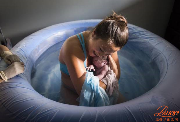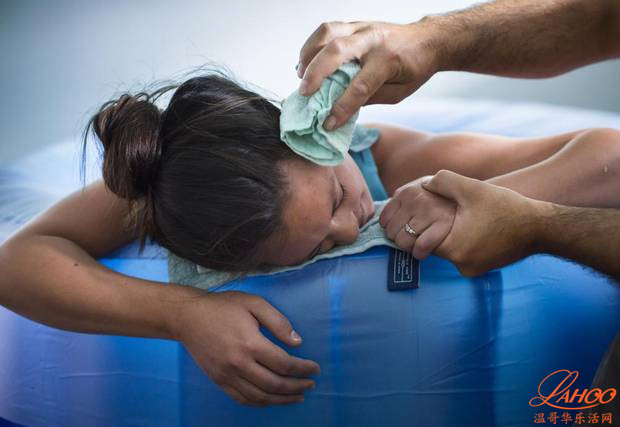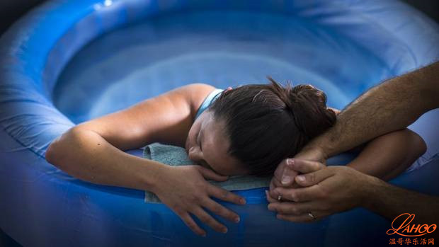 在过去一个小时里,布瑞林(Amy Brillon)一直蹲坐在一个装满水的蓝色充气水池里,她的头和手臂搁在水池边,她的丈夫陪伴在她的身边,他们正在等待一个新生命的降临。