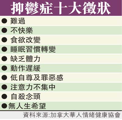 据卑诗大学(UBC)精神科教授谭望舒医生表示,情绪长期低落沮丧的人,可以对照抑郁症十大征状(见附表)作自我检视,一旦有四项以上相符的时候,就应该立即看家庭医生,以决定是否需要心理辅导以及转介专科医生诊治。