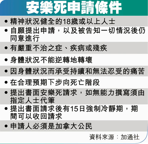 联邦政府周四正式公布极具争议的医生协助安乐死法案,其中限制申请安乐死的病人,必须是精神状况健全的18岁或以上加国公民,病况须达到难以忍受和正步向死亡的阶段。除医生以外,法案同时容许执业护士协助病人安乐死。