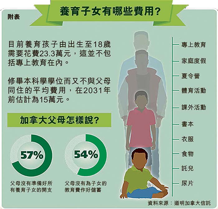 作为父母,你可曾计算过一个孩子在加拿大成长所花的费用?一份最新报告显示一个孩子出生到18岁共需花费约23.3万元,假如计算知子女大学毕业,费用更达38.5万元。而加国过半的父母并没有备足这笔资金,亦有过半父母没为孩子进行教育储蓄。有华裔家长更指,华裔为子女报读很多兴趣班等,开支随时超过这个数目。