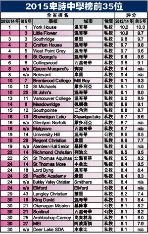 菲沙研究所(Fraser Institue)周四公布「2015卑诗中学成绩表」,在比较298家公立和私立中学学生的7个学术指标后,温西约克豪斯学校(York House School)和小花中学(Little Flower Academy)以满分10分并列榜首。至于能跻身前35名的公校只有5家。