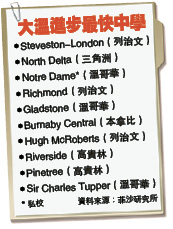 至于进步最快的中学则全由公校包揽,大温共有两家学校入围进步最快的前10家公校,包括较受华裔家长喜爱的列治文史蒂夫斯顿—伦敦中学(Steveston-London Secondary School,见附表)。
