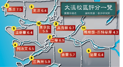 周四发表的菲沙研究所(Fraser Institue)「2015卑诗中学成绩表」,今年特别把全省57个公校教育局也作出评分。结果显示,西温教育局以7.5分名列榜首。而华人聚居的列市校区则排第5位,高于排第9的温哥华。