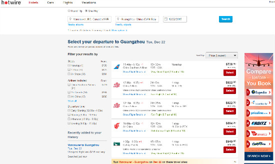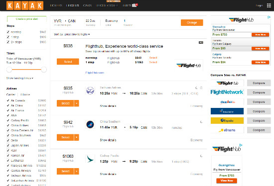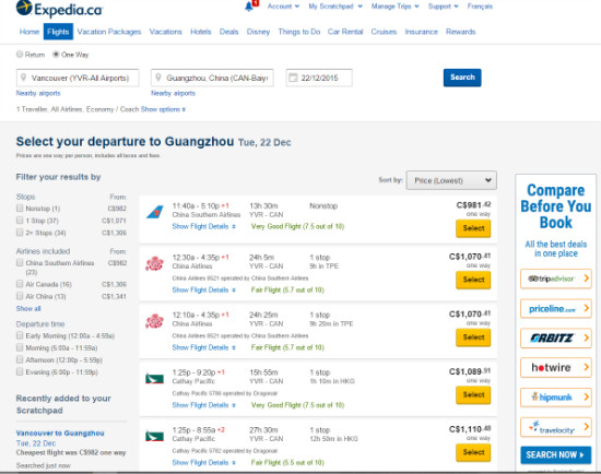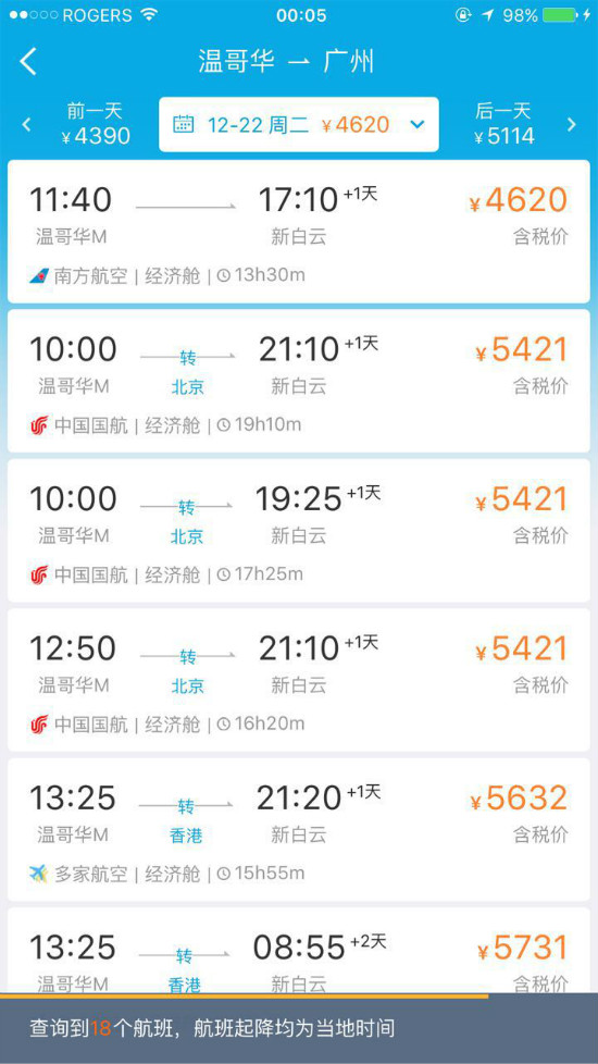 小编对于目前国内和加拿大口碑较好的10多个订票网站,在同一出发日期,同一航线,同一订票时间,单趟一站式行程进行了比对,而且选择的都是网站信息罗列的最低价,以12月22日从温哥华直飞广州白云机场、经济舱、单程,今天凌晨00:00开始查阅为例,这趟班次也是中国南都的读者,赶回家和中国的亲戚朋友共度圣诞节稍晚的一个班次,价格比对之后,到底谁在光膀子游泳,就一目了然啦。看清楚哦,是凌晨的00:00哦,手机电得充足供应,不然怎么经得起这么多数据的比对呢!