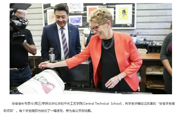 (加拿大乐活网lahoo.ca9月13日电)据加国无忧报道 ,安省省长韦恩今(周三)早探访多伦多的中央工艺学院(Central Technical School),向学生讲解经过改革的“安省学生援助项目”(Ontario Student Assistance Program,简称 OSAP)。她透露,现时就读12班的中学生,将成这个最庞大的学生援助优化项目的第一批受益着。省府定于2017年9月,落实推行OSAP中新的安省学生学费津贴(Ontario Student Grant),对父母每年收入低于5万元者,学生在申请贷款入读院校或大学后,毕业时无须偿还借贷款项。