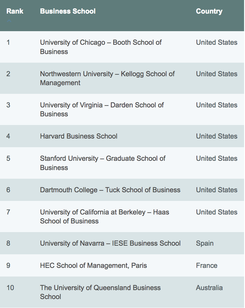 进入全球最佳MBA排行榜前十榜单的学校还有,维吉尼亚大学达登商学院(Darden School of Business)、哈佛大学商学院、史丹福大学商学研究所、达特茅斯大学塔克商学院(Tuck School of Business)、加州大学柏克莱分校海斯商学院(Hass School of Business)、西班牙的那瓦拉大学(University of Navarra)IESE商学院、法国巴黎HEC管理学院、澳洲昆士兰大学商学院。