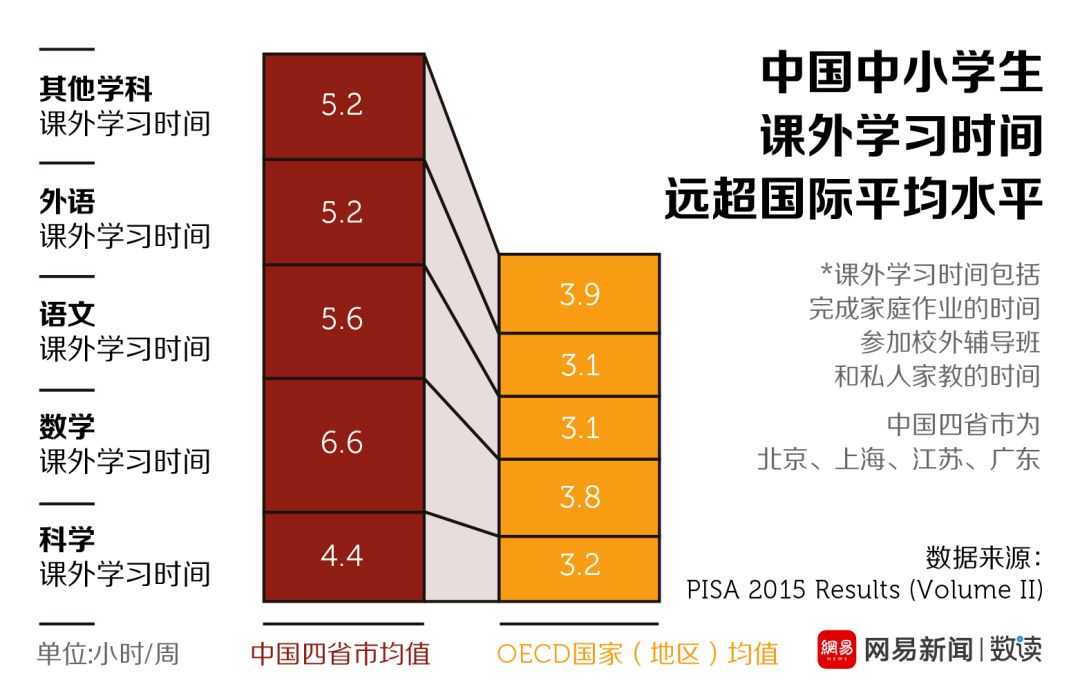 早在2015年,经合国家组织(OECD)就做了一项名为“国际学生能力评估计划”的调查,结果显示包括美国、加拿大、英国等世界主要发达国家在内的经合组织成员国中小学生在课外学习时间每周达到17小时。而此项调查同时评测了北京、上海、江苏、广东四地的中国中小学生课外学习时间,结果是惊人的每周人均27小时!