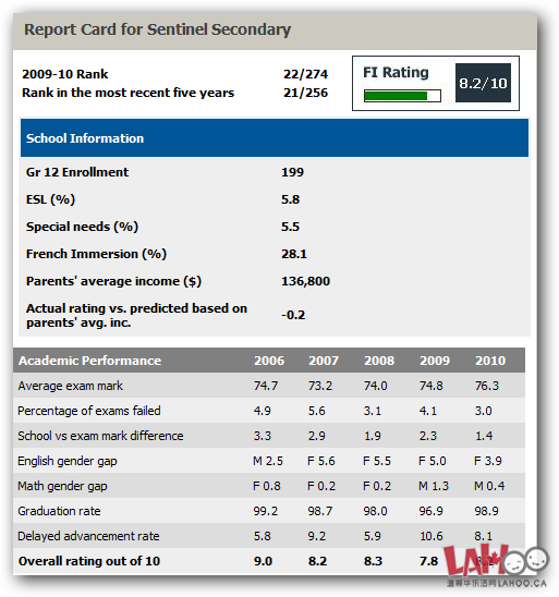 学校在最新的由Fraser Institute出炉的BC省和Yukon地区公立私立中学中排名为 22/274, 最近5年的平均排名为 21/256。