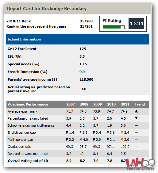 学校2010-2011年的总评分为8.2分(满分为10分),学校排名为 25/280 – 意思是在BC省和Yukon地区的280所公立私立中学中排第25名。最近5年排名为25/261。由排名可见,该学校是一所非常优秀的公立中学。