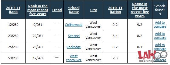 按照 Fraser Institute (菲沙研究院) 最新的BC省和育空地区的中学排名,2009-2010年度,这5所学校在西温哥华地区的排名次序如下: