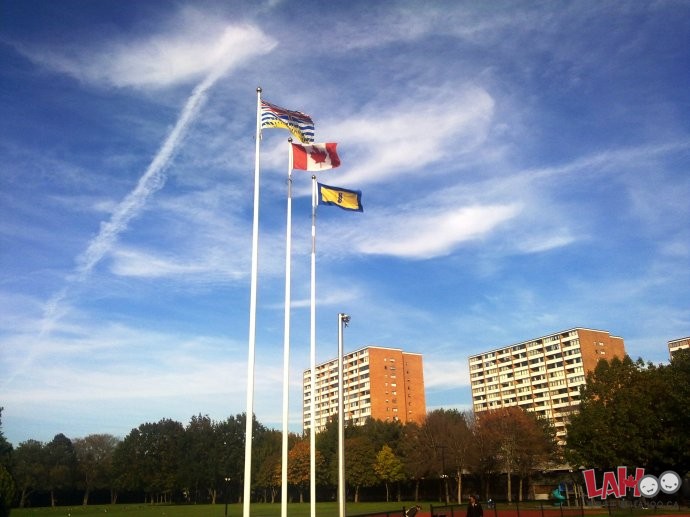 图2:加拿大三级政府的旗帜飘扬在列治文的同一片蓝天下。从左至右,分别是BC省省旗、加拿大国旗、列治文市旗。