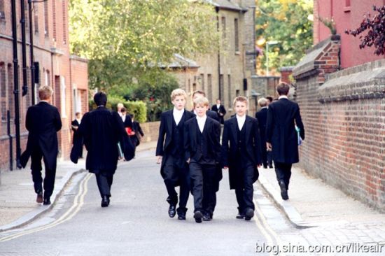 这些男孩子们被要求每天穿着燕尾服上学。无论严寒酷暑、春夏秋冬,都穿着同样的长款黑色制服,里面一件薄薄的衬衣和西服背心,下身一条黑色长裤,配一双黑色皮鞋。只有上体育课时可以例外,但也得穿学校指定的运动服,时刻保持最好的仪态和着装。在伊顿的教育理念中,他们要培养的是一流的英国绅士。燕尾服是绅士精神的外在体现,当你穿上这样的衣服,你的身姿自然就会挺拔起来,你的音调也会开阔起来,气场也会提升起来。你对自己的存在会有所觉察,有所要求。因此,穿制服,是对对方的尊重,也是对自己的尊重。